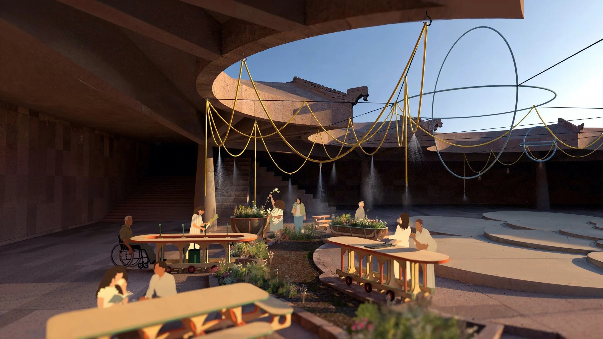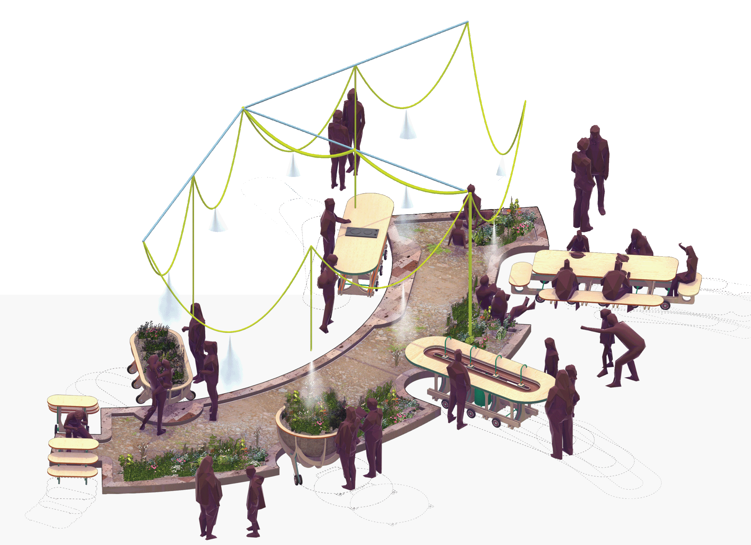 Instead of employing the form of a parliament, a common trope of institutionalized idealization of democracy, this summit frames climate discussions around acts of planting, foraging, chopping, cooking, and dining. Each stage of the process is designed as a movable module fabricated out of wood, soil,and burlap fiber. The growing of herbs will take place within a farm in Kapan, 4-months before the opening. Utilizing the site’s existing water infrastructure, an integrated irrigation and misting system will be installed within the courtyard of the Republic Square metro station.